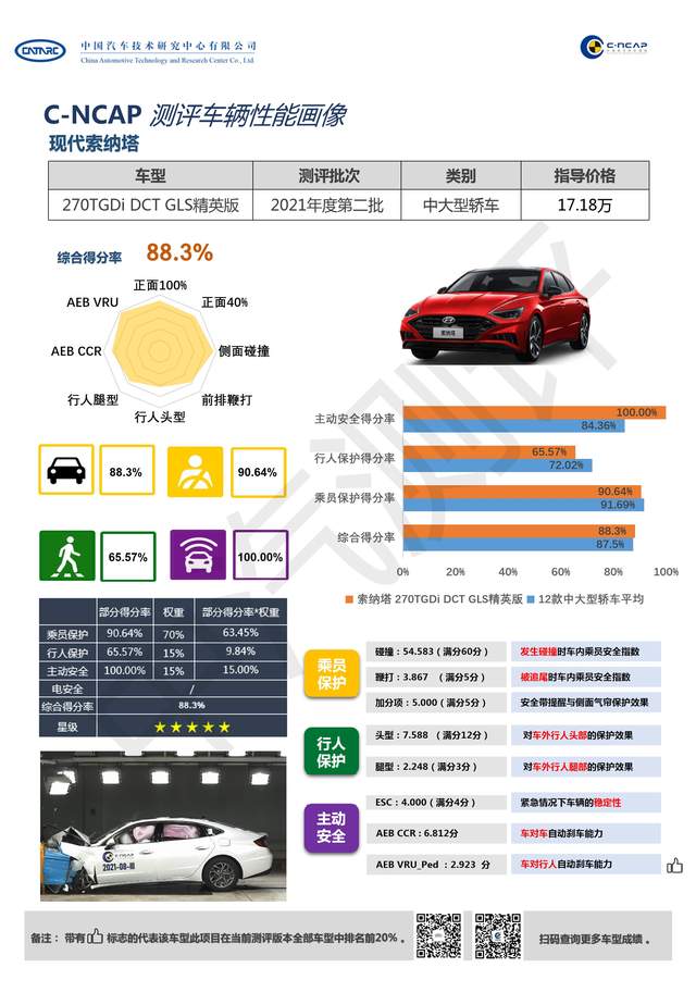 索纳塔8代、9代都在C-NCAP有过测试记录,而索十终于也被选上了,270TGDi DCT GLS精英版属于车系次低配车型,售价为17.18万元。