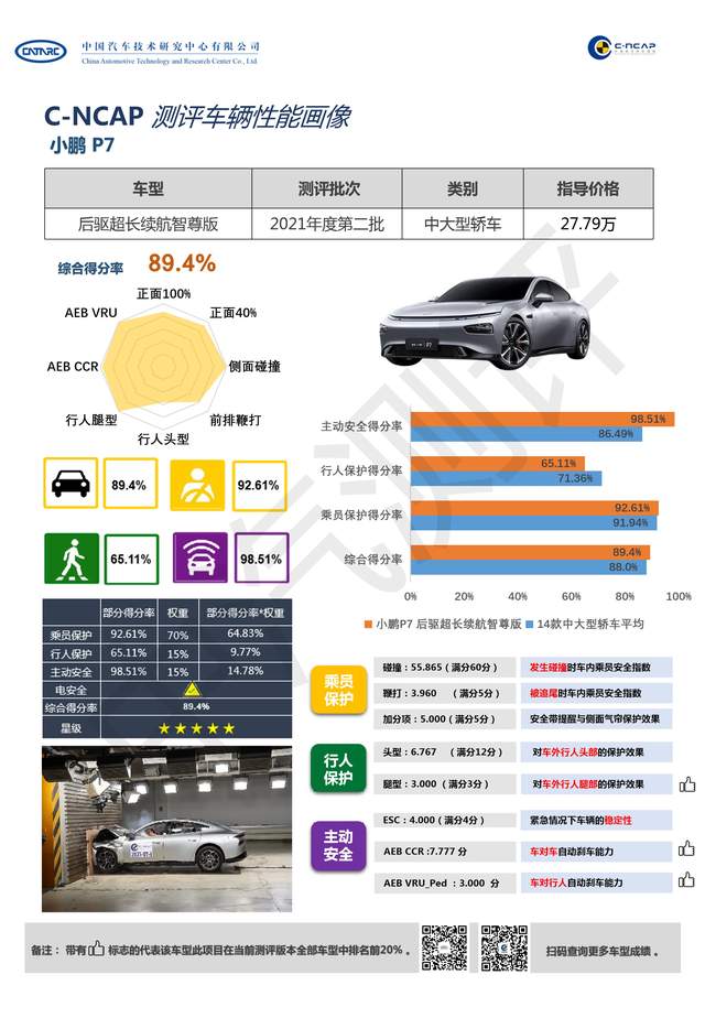 碰撞测试结果显示小鹏P7的乘员保护得分率为92.61%,行人保护得分率为65.11%,主动安全得分率为98.51%,综合得分率为89.4%,获得五星评价。除了行人保护方面还需有待提高之外,其余几项得分率均在同级参与测试车型之上。