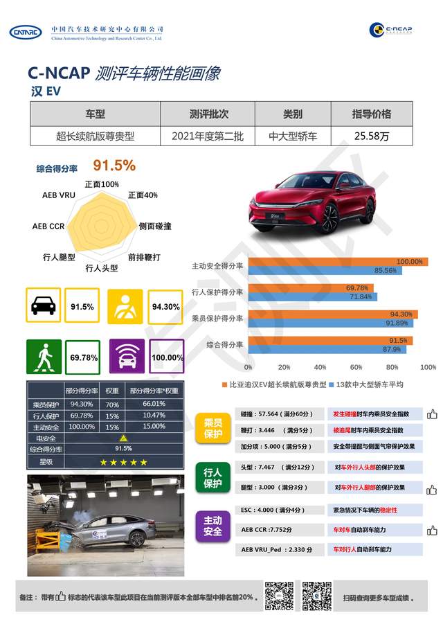 碰撞测试结果显示汉EV的乘员保护得分率为94.30%,行人保护得分率为69.78%,主动安全得分率为100%,综合得分率为91.50%,获得五星评级。同时也成为了今年测试得分最高的轿车,仅次于最高分的宝马iX3。