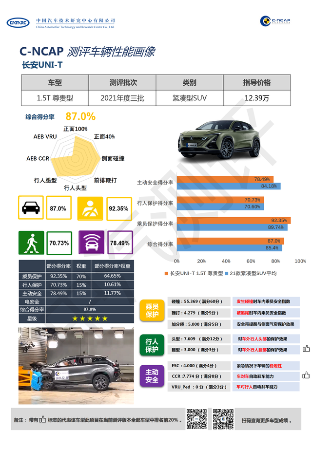 测试结果显示长安UNI-T乘员保护得分率为92.35%,行人保护得分率为70.73%,主动安全得分率为78.49%,综合得分率为87.0%,获得五星评价。值得注意的是,成绩表中显示UNI-T的主动安全得分率略低于同级车型测试成绩水平。