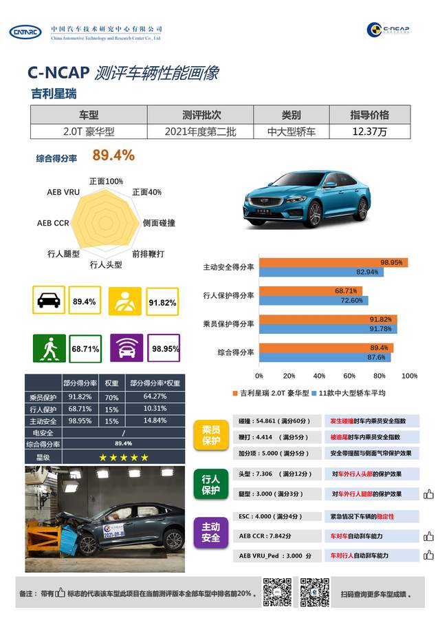 吉利星瑞作为一款紧凑型轿车,可以说是最新一轮测试成绩中“最小”的车型,但在C-NCAP却被划分到了“中大型轿车”领域。而12.37万的2.0T豪华型是车系中的次低配车型,那么“沃里沃气”的它是否拥有“沃”一般的安全性能呢?