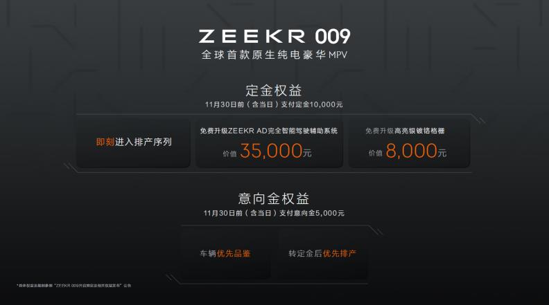 定金权益:11月30日前(含当日)支付定金10,000元,即刻进入排产序列。免费升级价值35,000元ZEEKR AD完全智能驾驶辅助系统,免费升级价值8,000元高亮银镀铬格栅。