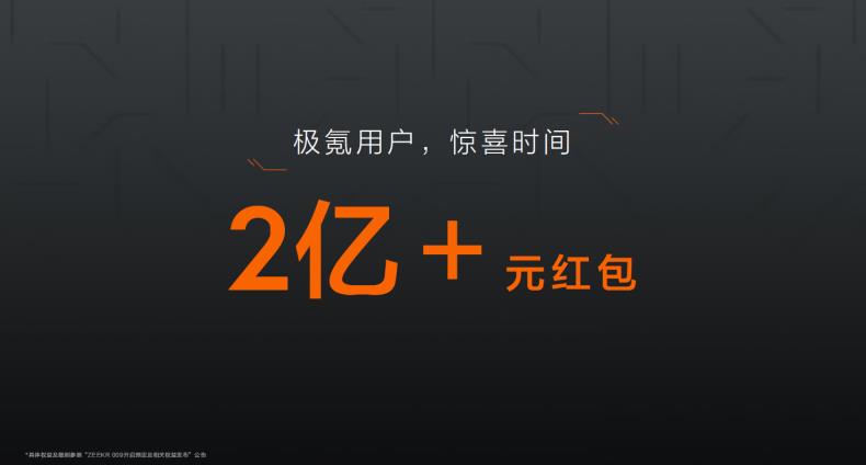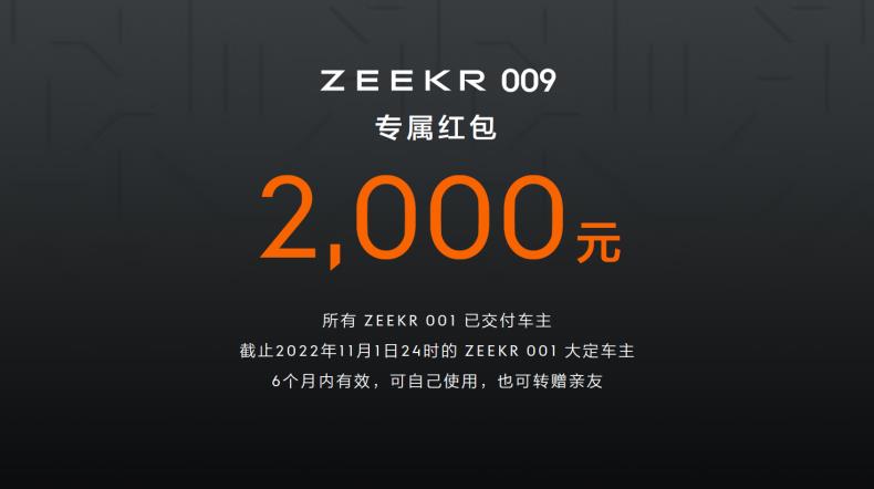 同时,极氪为001车主准备了价值超过2亿元人民币的专属红包:所有极氪001已交付车主,以及截止2022年11月1日24:00点前的001大定车主,都将获得价值2000元人民币的极氪009专属红包(可自用/转赠送亲友,6个月内有效)。