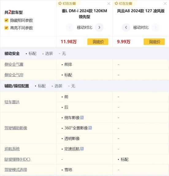 我们就用售价接近的11.98万元秦L DM-i领先型和11.99万元风云A8凌风版对比,配置上风云A8有点差。