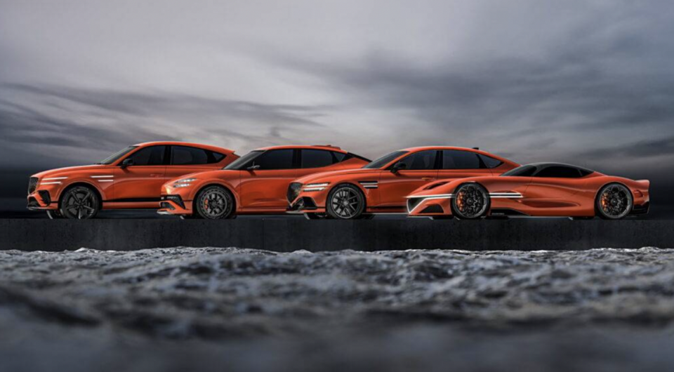 从命名上就能判断,新车就是捷尼赛思的旗舰级轿车,当然也是高性能序列的旗舰,整体外观造型基本延续了现款车型的设计,家族风格的元素辨识度很高,很有韩系大女主的感觉,尤其是橙色的外观是它的专属配色。