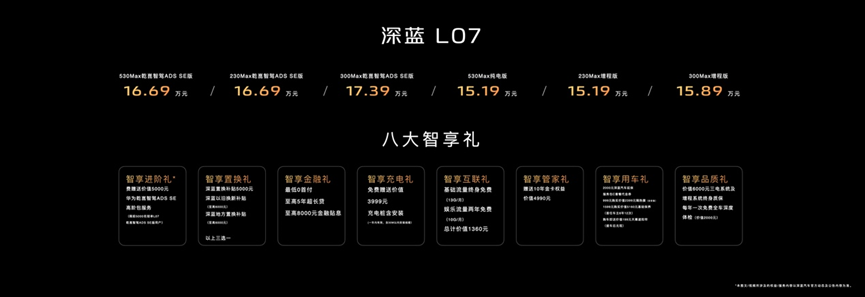 此次深蓝L07新车型共推出6个版本,售价区间为15.19万元-17.39万元,不仅提供增程和纯电两种动力选择,更在智能化上与华为深度合作,提供三款搭载华为乾崑智驾ADS SE解决方案的丰富智驾车型选择。