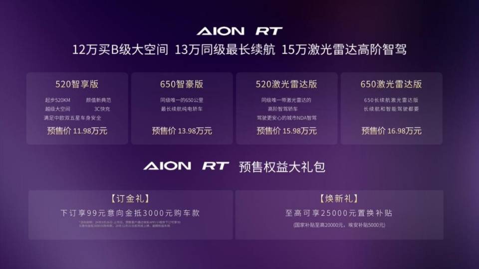 继埃安霸王龙以后,这款AION RT是埃安品牌的第二款全球车型,凭借高颜值外观、越级大空间、同级超长续航与快速补能、同级首搭激光雷达高阶智驾等超强实力,成为全球新典范,是A+级轿车市场必看必试的优秀选择。它的到来既吸引了年轻人的智驾需求,也重塑了A+级轿车格局。12万买得到B级大空间,13万就能拥有同级最长续航,15万元首搭激光雷达高阶智驾。累计上预售权益大礼包,预感AION RT在市场中的表现将会惊艳众人。