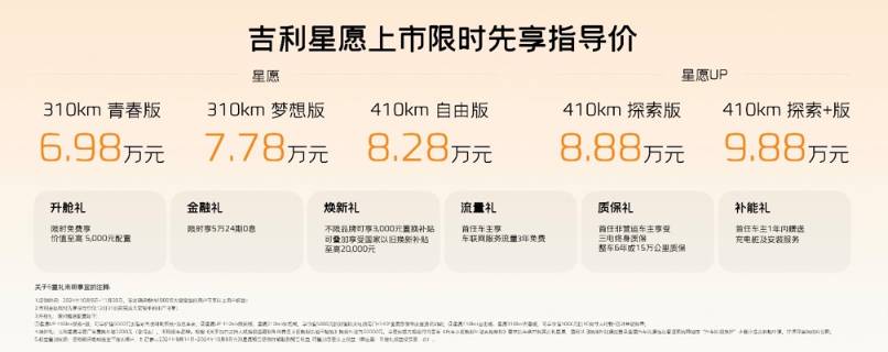 所以,面对如此庞大的购车群体,如何做一款对的车,对于吉利来说,是必须思考的问题。于是,10月9日,吉利星愿来啦。此次新车共推出星愿和星愿UP两个系列5个版本车型,售价区间6.98万元-9.88万元。