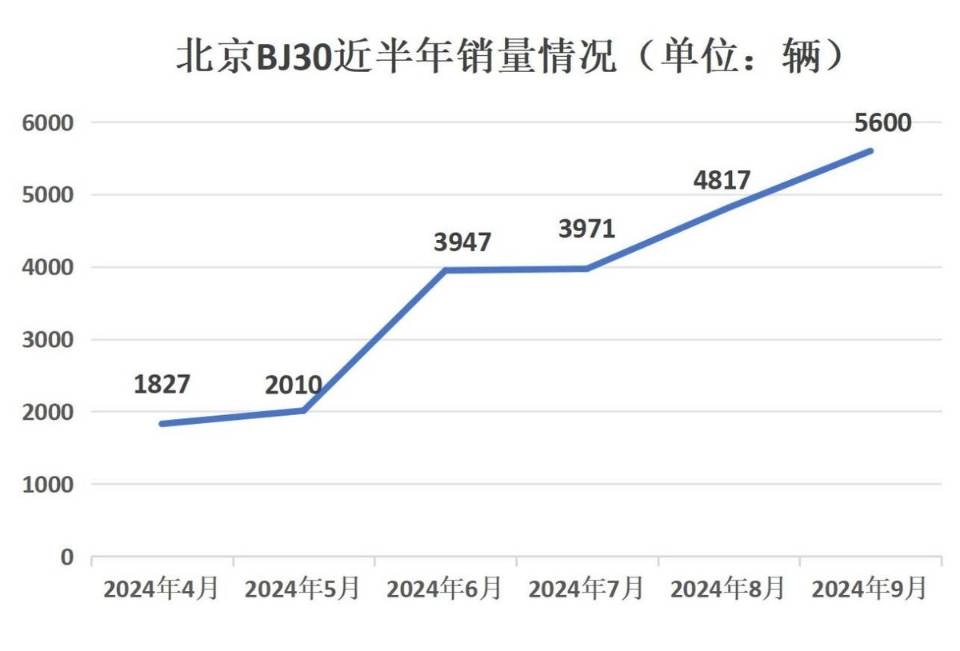 具体来看,全新北京BJ30在今年的5月22日正式上市,而上市首月其便取得了2010辆新车的销量成绩单。再往后的6-9月,BJ30销量一路上涨,分别取得了3947辆、3971辆、4817辆和5600辆新车的月销量成绩单。至此,全新BJ30成功实现了自身销量上的“五连涨”。